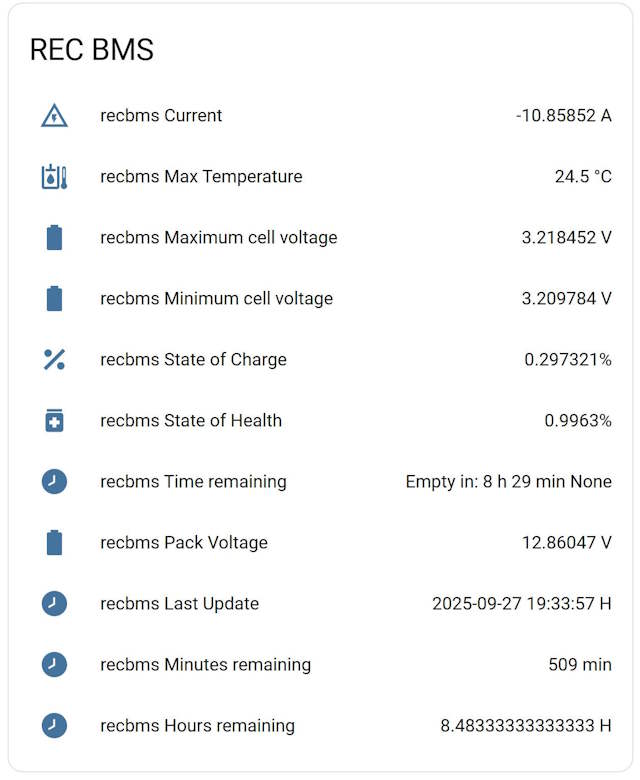 This allows you home assistant to connect to REC BMS sensor and display: