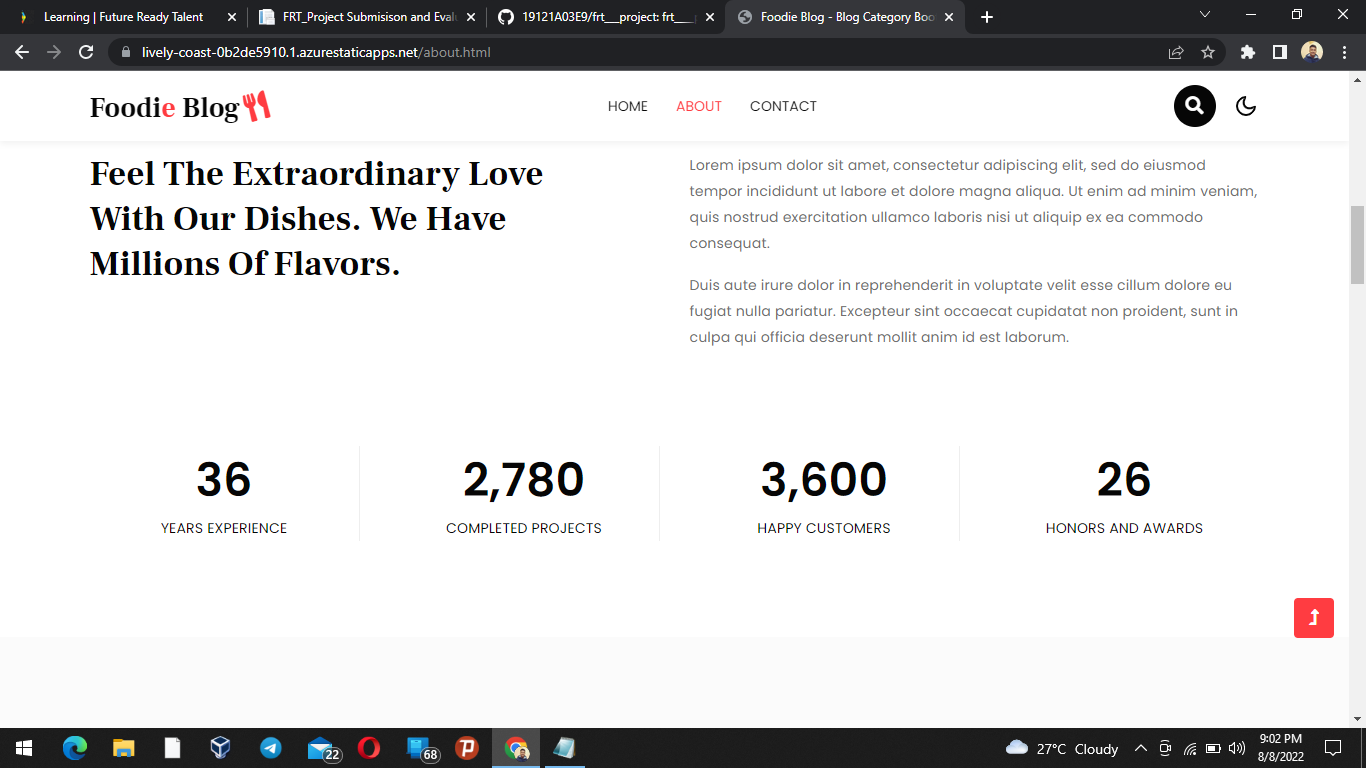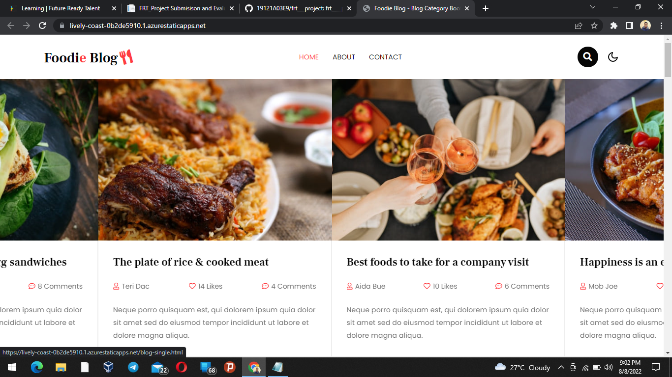 frt food project Below is my final FRT project with some samples of screenshots. Azure website Link https://lively-coast-0b2de5910.1.azurestaticapps.net/ #Homepage #About page #Contact page