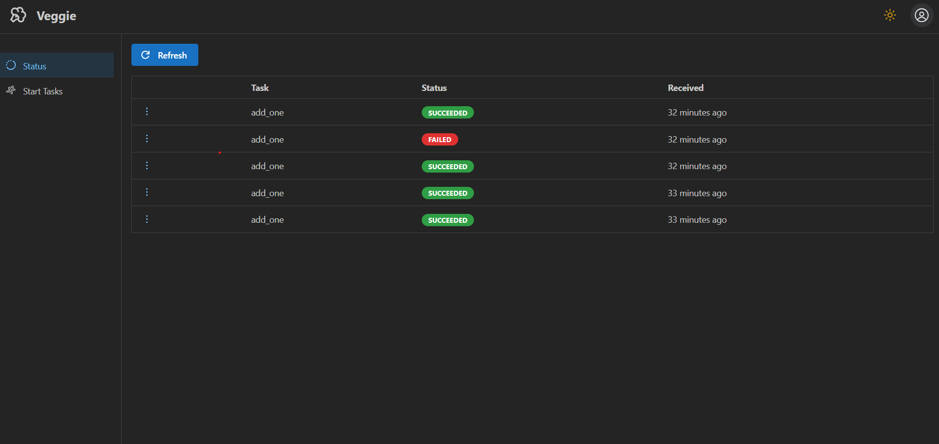 pip install veggieTo enable better task monitoring, add the following to your Celery application: