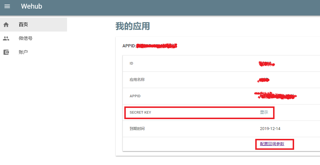 自0.2.2版本开始,wehub引进了"安全性验证"机制. 第三方的管理员请登录WeHub后台 对回调参数进行配置, 系统会自动为每一个appID生成了"secret key"(该值用于之后的签名计算).