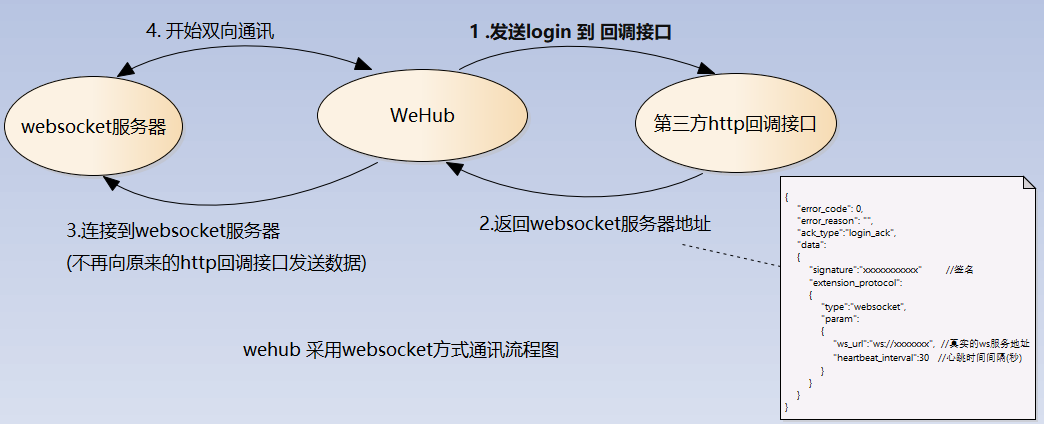 wehub会先发送login request到当前回调地址,然后尝试从respone中寻找extension_protocol字段, 并获取到要去连接的websocket服务器的真实ws地址(格式为ws://xxxx或者wss://xxxx,和原有的http回调地址不一样). 这样做的好处是把目前的回调接口当做跳板,并且可以配置多个ws地址进行负载均衡.