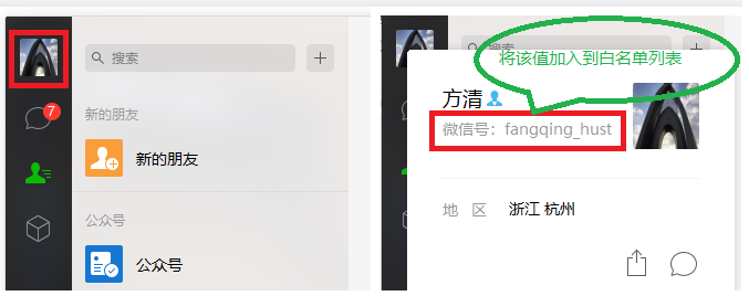 点击该微信PC客户端左上方头像,将弹出的界面中显示的微信号的字符串值加入到的白名单中.