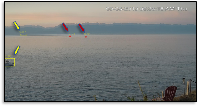 Red bounding boxes indicate boats identified using small time series and a novel bi GMM system in the Detector of Small Marine Vessels (DSMV). Mid- and large-sized boats are tipically recognized with the use of pre-trained end-to-end object detectors (yellow bounding boxes). The Hybrid system combines both outputs, resulting in a system capable of identifying boats ranging from pixel-level (~80 pixels of area) to large (>1,500 pixels of area).