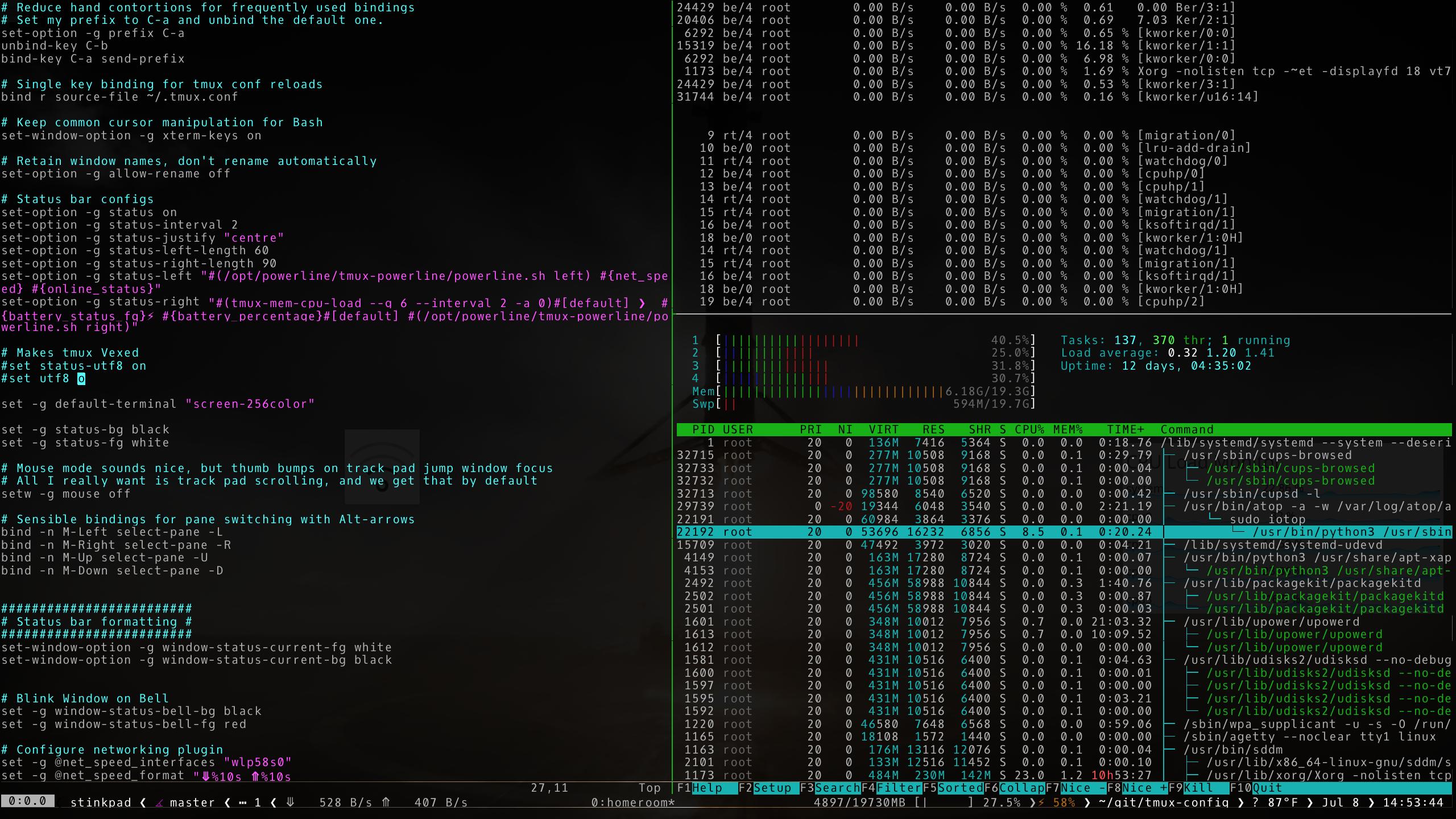 tmux Config This is my tmux config. I tune it frequently, so it needs a safe home. Feel free to copy and improve it. :) Major Inspiration Sources Hermann Vocke's blog posts