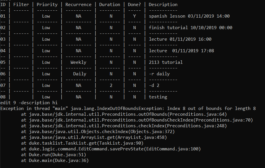 Editing a task whose index not within the range crashes the program