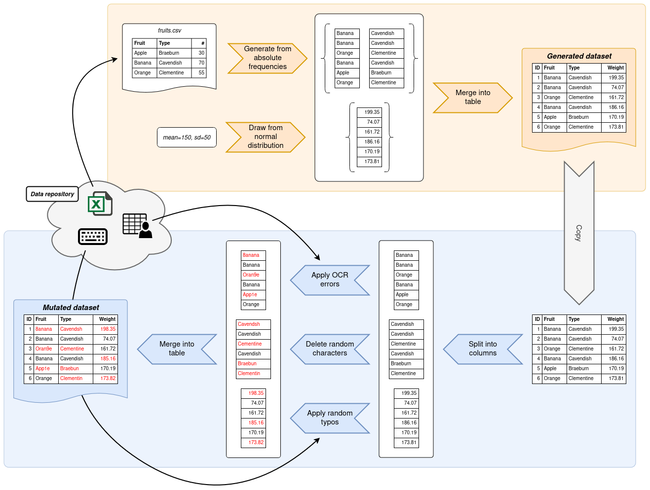 In the second step, a copy of this dataset is mutated. Gecko provides functions which deliberately introduce errors into your dataset. These errors can take shape in typos, edit errors and other common data sources. By the end, you will have a generated dataset and a mutated copy thereof.