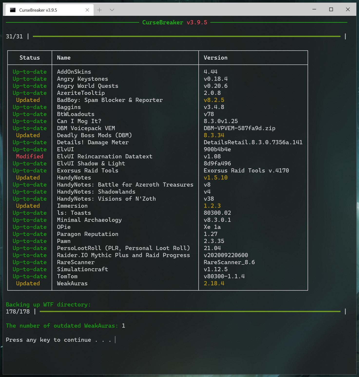 headlessparameter entire addon and Wago upgrade process plus WTF backup should be executed in the background. Log file CurseBreaker.html will be created in the same directory as the application.