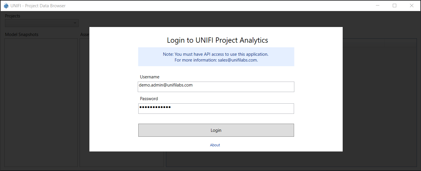 After launching the application, enter your UNIFI username and password. Once logged in, the application will populate the Projects dropdown menu with all of the Project Analytics projects in your company.