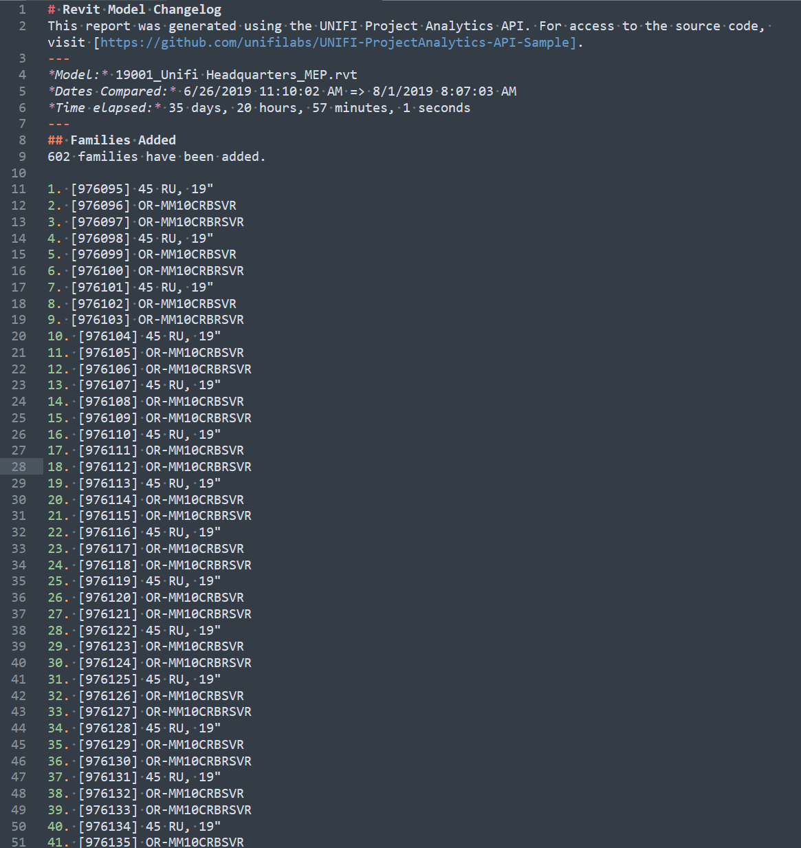 This C# WPF application is a simple example of using the UNIFI Project Analytics REST API. With this application, users can review the historical data collected by Project Analytics. Additionally, users may choose to automatically generate a changelog to identify which Revit families were added or removed from a model as of any point in time.