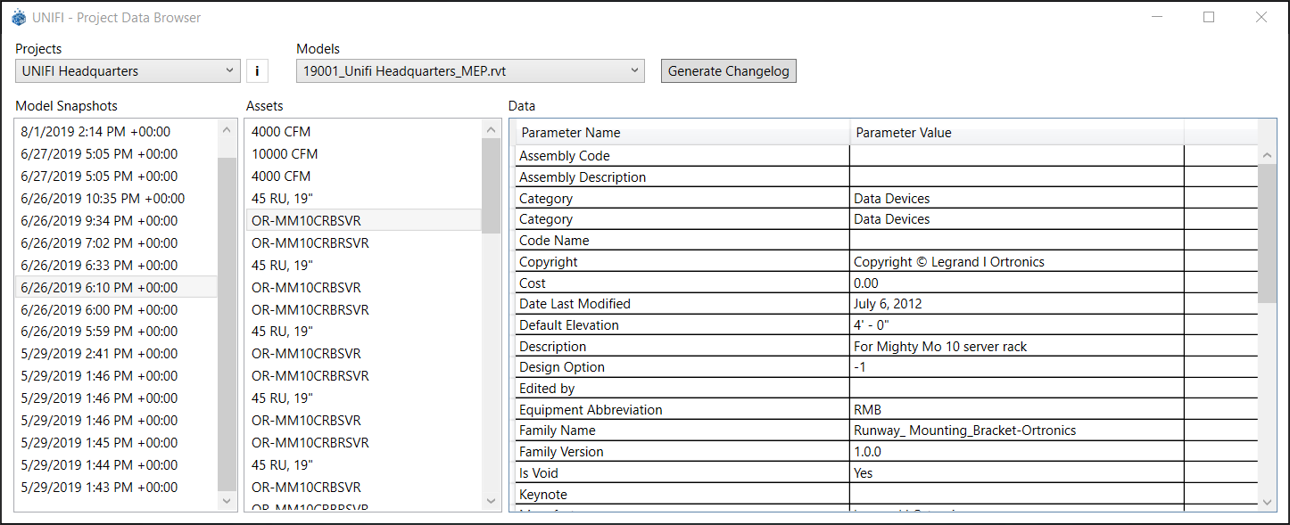To demonstrate how to retrieve a subset of the data that UNIFI is collecting, we've built the ability to select any model snapshot (a specific sync to central) and review the Revit family instances and their parameter values as of that day and time.