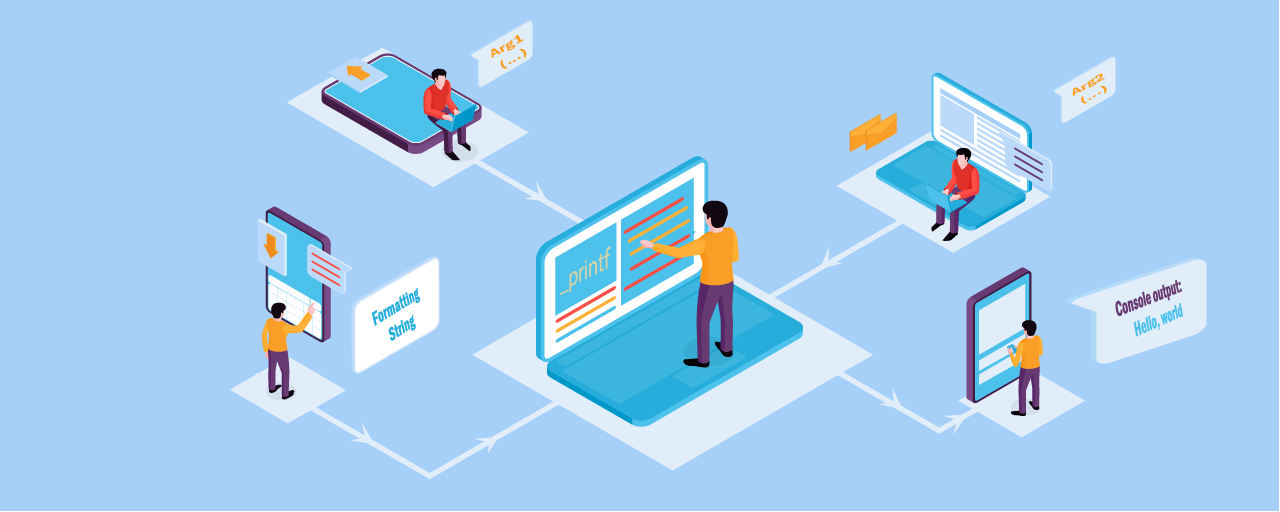 This project is about recreating our printf function, which belongs to a standard C language library. Its main function is to send a standard output according to the format, fomatting the past arguments and turning them into the arguments os a charracter string. For this project, the main function will be used as _printf to diffrentiate it from the original printf.