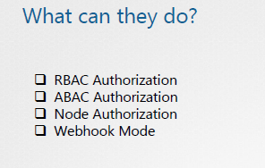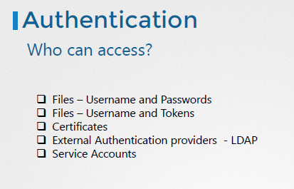 Basic security Kubernetes security First line of defence: control access to APIServer Authentication Authorization Communication encryption Pod-Pod communication All pods can talk to each other. can restric using network policies