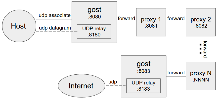 注: 转发UDP数据时,如果有代理链,则代理链的末端(最后一个-F参数)必须是gost SOCKS5类型代理,gost会使用UDP over TCP方式进行转发。