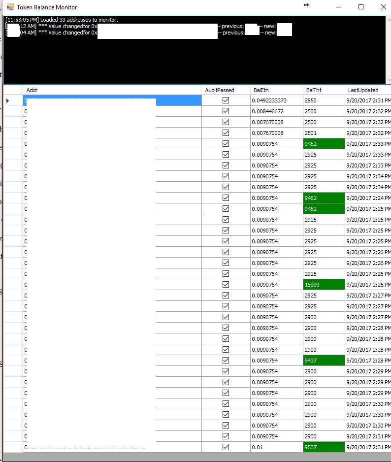 Monitor ETH and TNT token balance of Ethereum addresses, and node audit status according to TNT servers.