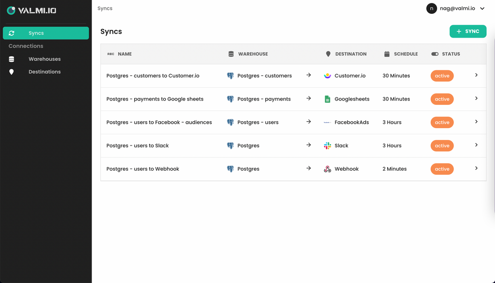 valmi.io Customer Data Platform (CDP) provides open-source Reverse ETL (data activation) platform to load data from warehouses into SaaS platforms such as Advertising (Facebook Ads, Google Ads), Marketing (Klaviyo, Braze), CRM (Salesforce, Hubspot), Accounting (Xero, Netsuite), Customer Support (Zendesk), Messaging (Slack), Webhook Apis etc.