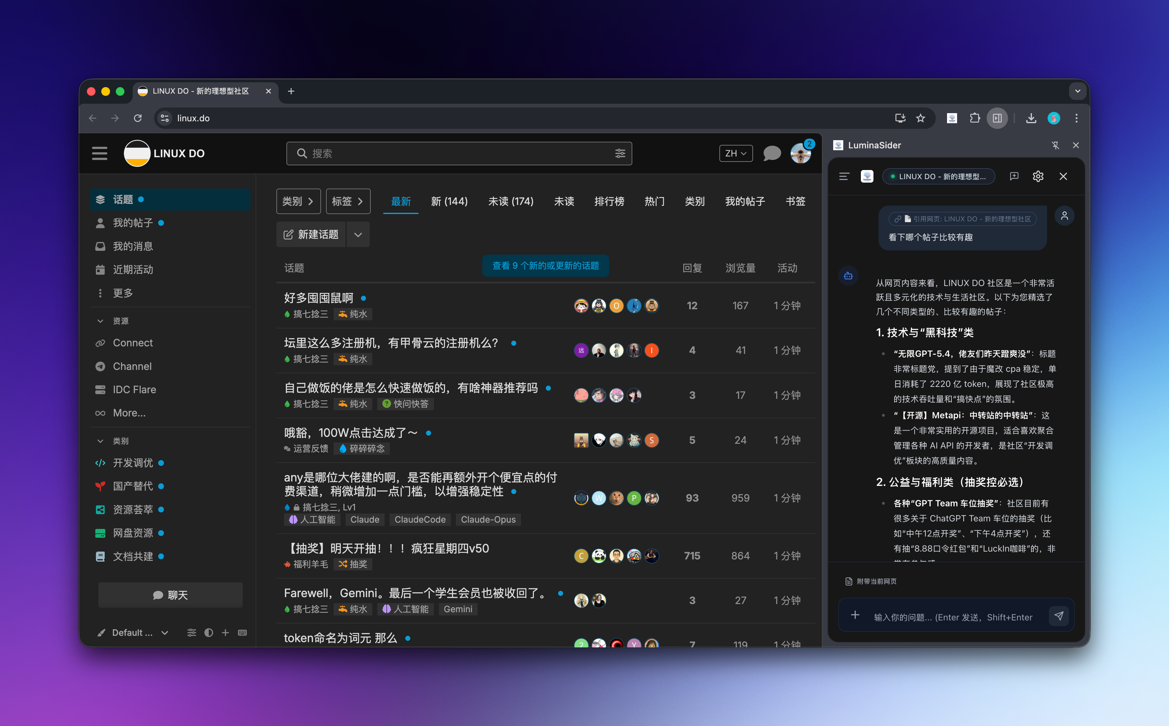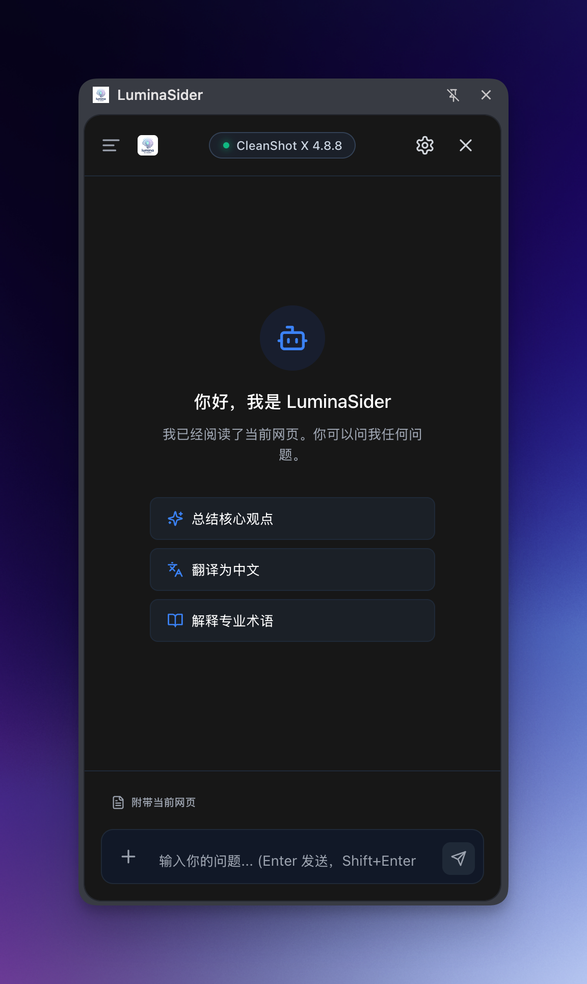 LuminaSider 是一款基于 Chrome 浏览器扩展 (Manifest V3) 的侧边栏 AI 助手。它打破了传统 AI 助手需要频繁切换标签页的体验,在用户当前浏览的网页旁注入一个侧边栏,提供“伴随式浏览”与“基于当前网页上下文的精准问答”能力。