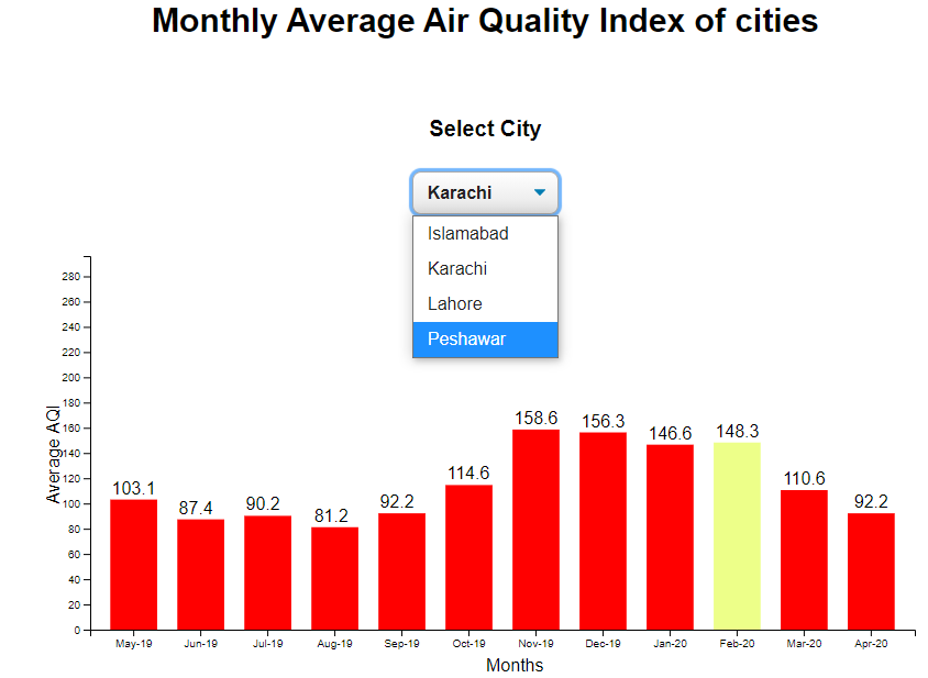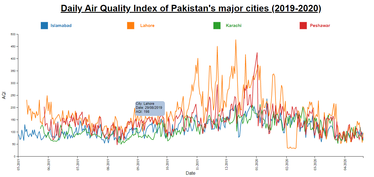 Air quality is a major concern for people in Pakistan and around the globe. In many industrial and urban areas air pollution is causing damage to humans, plants, animals and ozone layer etc. due to release of harmful gases by various resources. In this project, we visualize the data of air quality of four major cities of Pakistan which include Karachi, Lahore, Islamabad, and Peshawar, the air pollutant for which is, Particulate Matter (PM 2.5). The dataset for the study is sourced from an online repository, collected in the time span ranging from May 2019 to April 2020. Three visualizations namely, Bar chart, Donut chart and Line chart are generated. These interactive visualizations are developed using D3.js and provide essential insights of data according to Year, Month, Day or the severity of air pollution. As per the designed visualizations, there has been a significant increase in air pollution during the end of 2019, whereas during the start of 2020, the air pollution started to decrease.