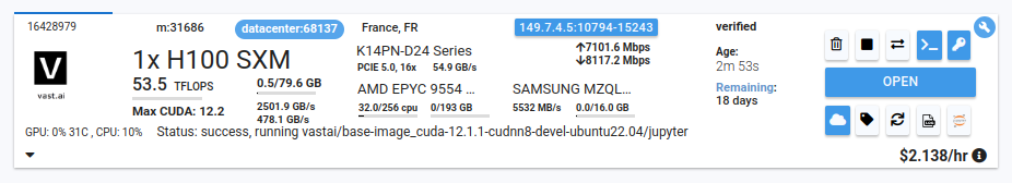 The Vast.ai CLI tool comes pre-installed on your instance, allowing you to stop it from within. An instance-specific API key is already configured, giving you the ability to control this instance while you're logged in.
