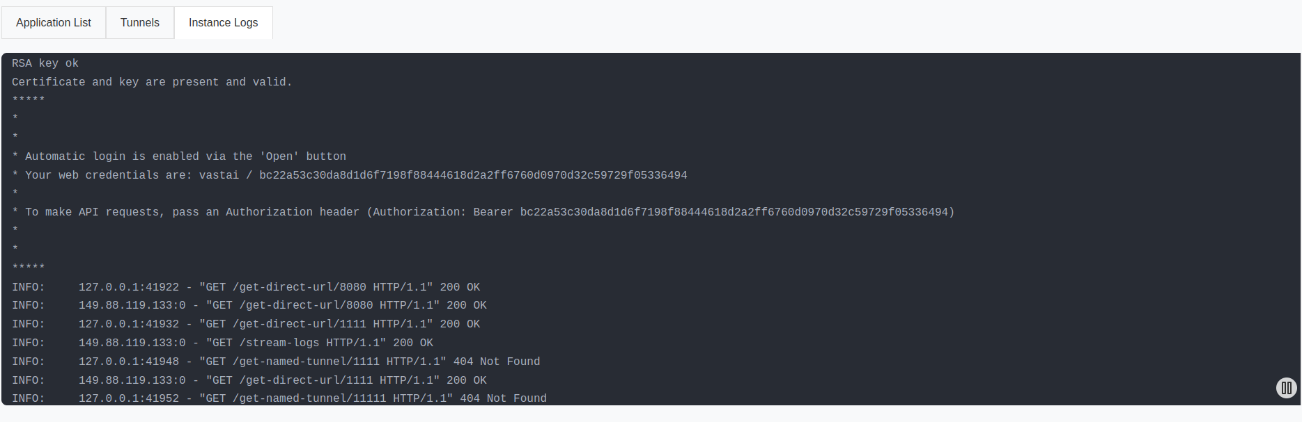 This sets a cookie using your OPEN_BUTTON_TOKEN, granting you access. Without this, you'll see a login prompt (username: vastai, password: your OPEN_BUTTON_TOKEN).