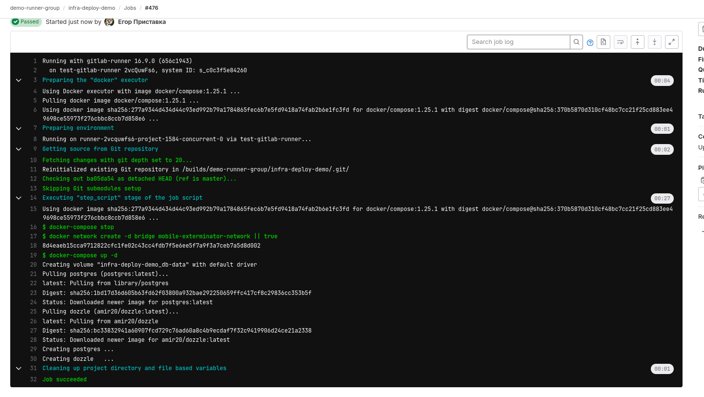 Тесты прошли, значит можно развёртывать приложение на удаленном сервере. Для деплоя будем использовать настроенный ранее раннер.