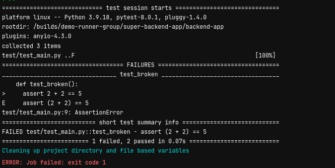 В yml файле мы указали образ докера который будет использоваться (в нашем случае это python 3.9), тег используемого раннера, команды, которые надо выполнить перед основным скриптом (у нас это установка зависимостей из requirements.txt), а также команду на запуск тестов в основном скрипте.