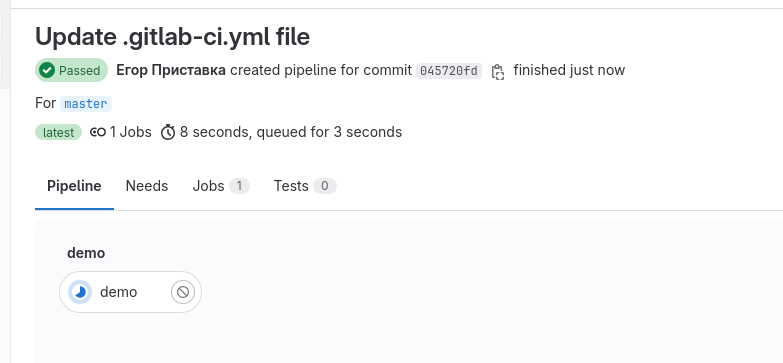 После коммита пайплайн начинает работу. После завершения видим следующее:
