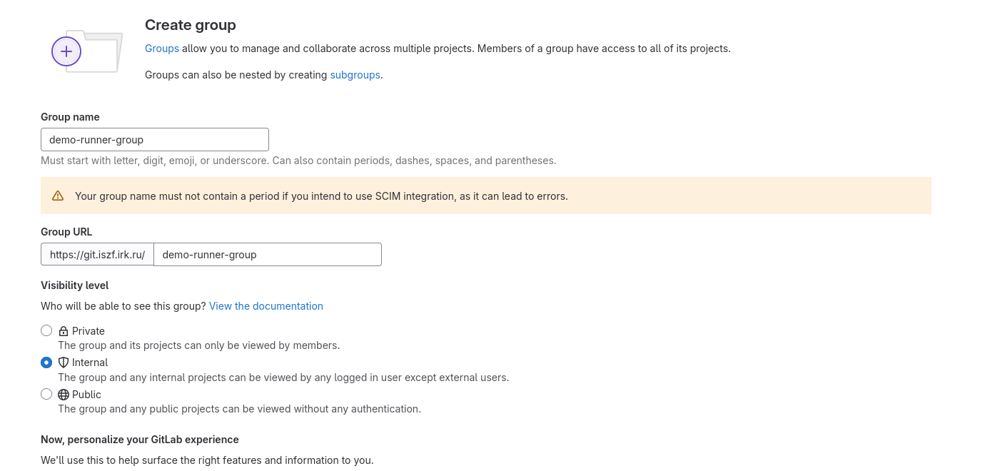 Для большего удобства работы с проектами, сделаем раннер групповым. Создадим группу