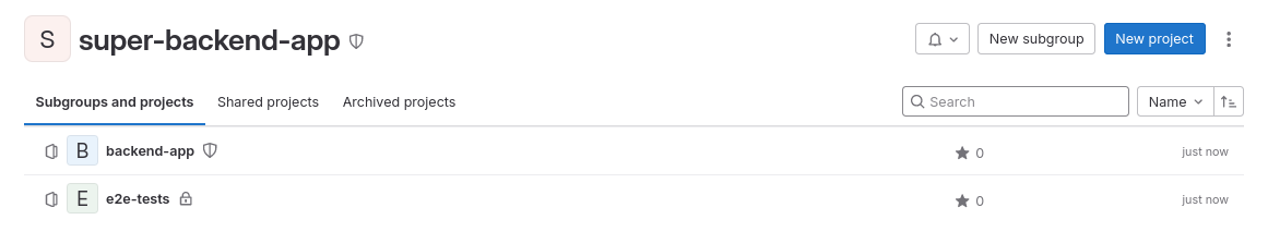 Создадим подгруппу под наш проект, назовём её super-backend-app . В ней создадим два проекта backend-app и e2e-tests
