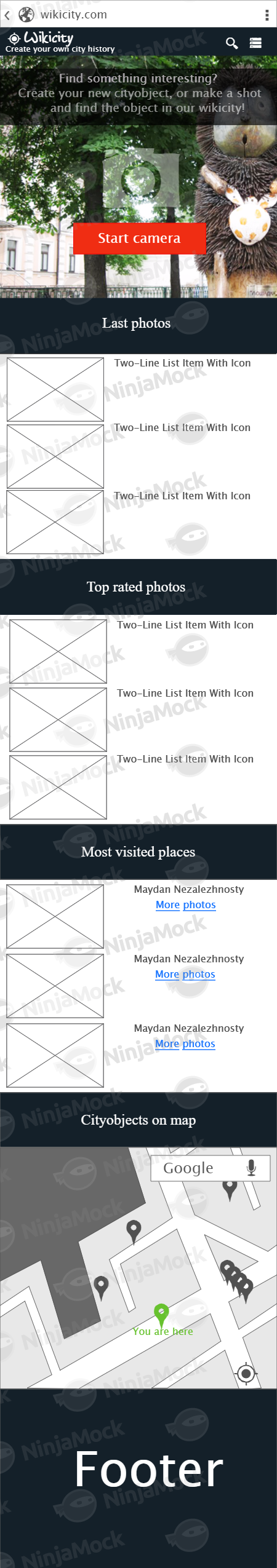 **Fonts:** Logo Wikicity - TomsHandwritten; Headers - Open Sans; Other text - Lucida Sans Unicode **Цвета** Основной фон FF142029(темно синий) Красная кнопка FFF02D13 Зелёные элементы FF67C22E **Макет страницы**