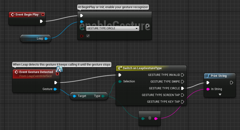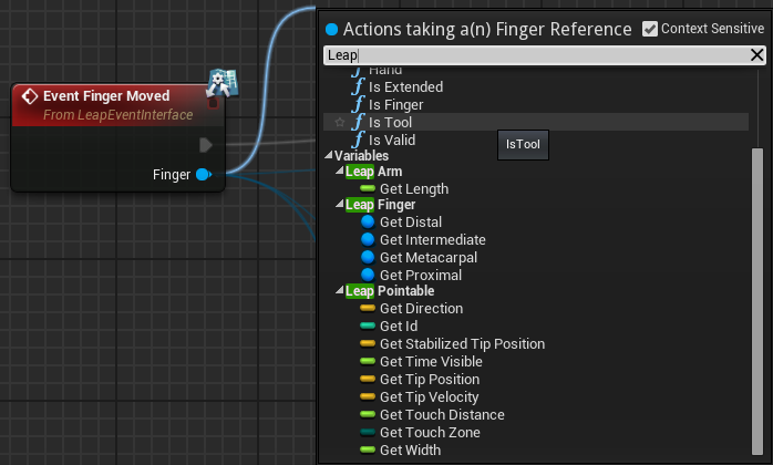 Main method of use is by subscribing to events within your blueprint, but it also supports polling through functions called on the LeapController for up to the 60 past frames. You can extend functionality to any blueprint through adding the LeapInterfaceEvent interface then adding the LeapController component to that blueprint. This same architecture is available to C++ if you prefer, which also supports both event-driven and polling style use.