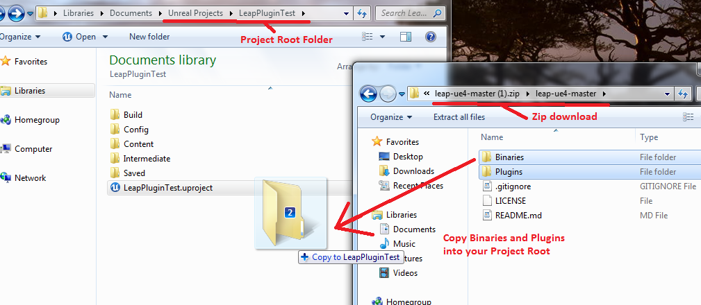 - In your packaged directory drag the Binaries folder from this plugin into your packaged project folder. E.g. if I have a packaged folder called LeapPluginTest find WindowsNoEditor/LeapPluginTest, this is your packaged project root. Add the binaries folder there.