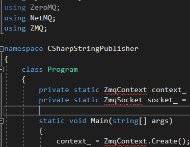 I've been playing around with CSharpStringPublisher project for which I've installed zeromq, clrzmq and netmq. Despite this, ZeroMQ appears to be greyed out and context and socket cannot be located as in screenshot.
