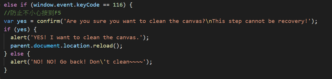 因為我認為會不小心按到的是像只有一個鍵的"F5"跟頁面上的"clean the canvas",所以二次確認功能就只做給這兩個部分,不然怕使用者覺得囉嗦。