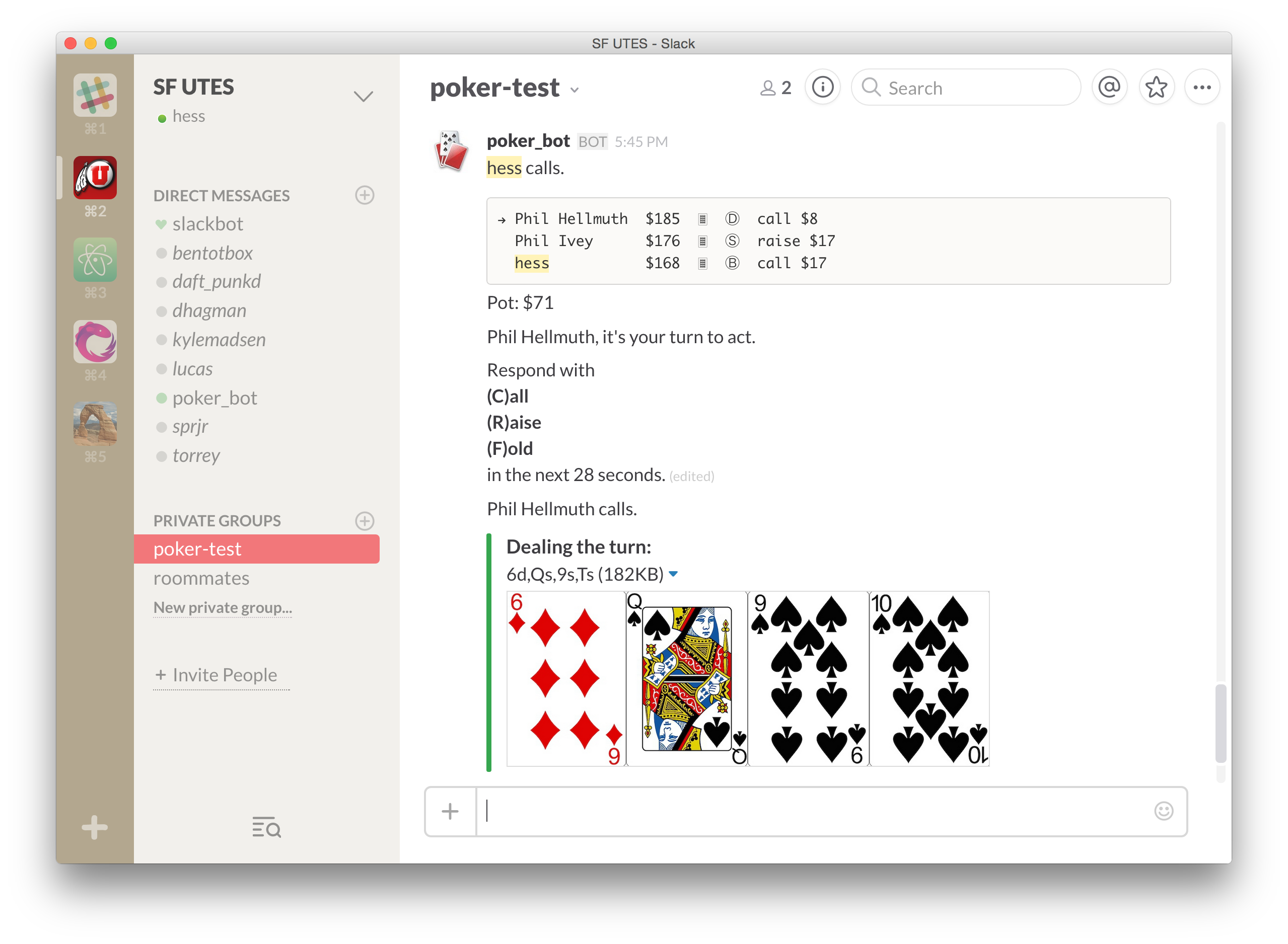 A bot that turns Slack into a legitimate Texas Hold'em client. Start a game in any channel or private group with 2-10 players. PokerBot will deal hands, direct message players with their hole cards, query players (in order) for their action, determine the winning hand, and handle the pot.