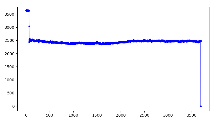 note: sending the 3694 pixels over USART1 at 500000 baud takes ~150ms, so if your total exposure time is much less than this, you might as well average a couple exposures before sending them