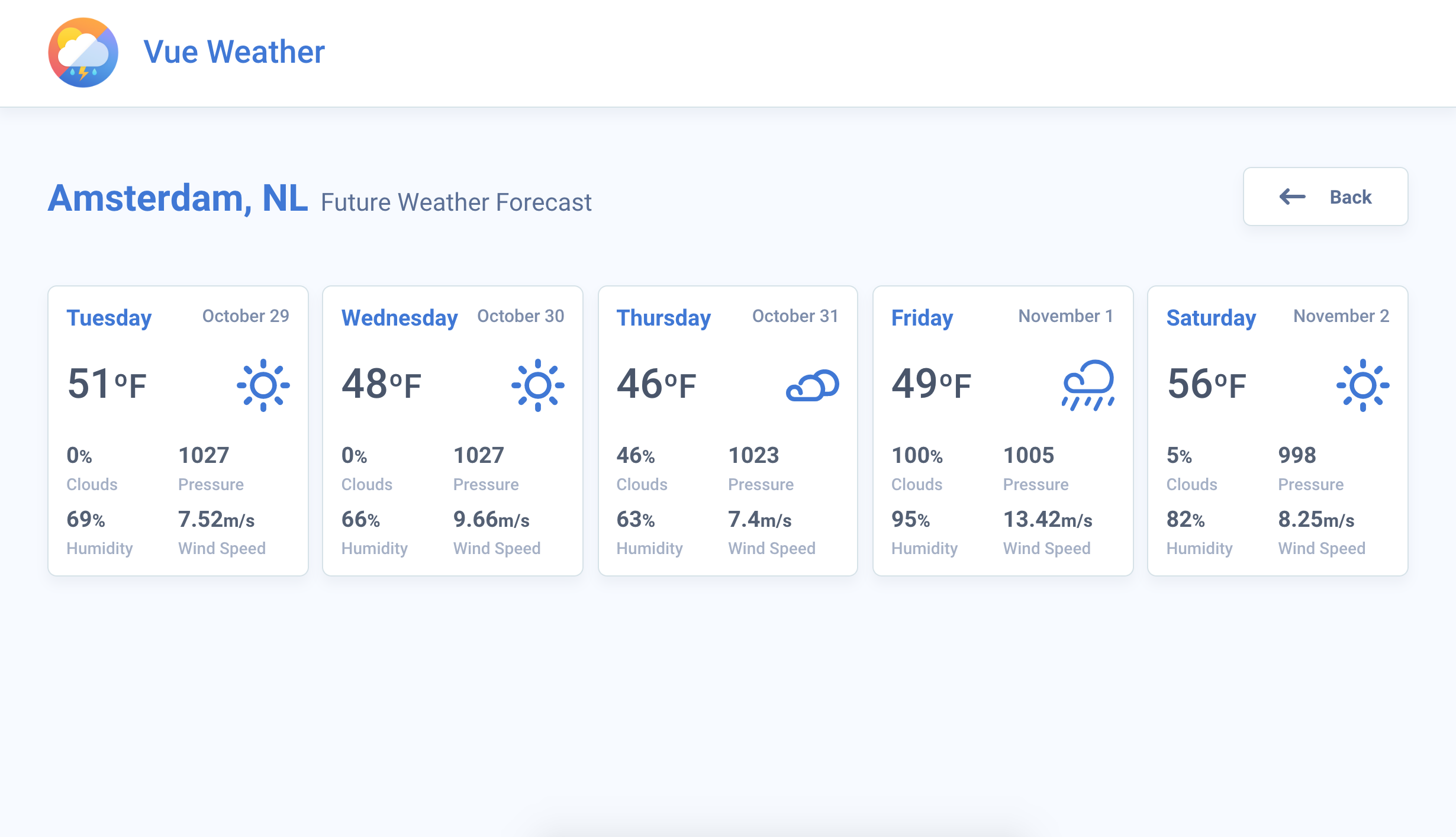 Vue Weather Dashboard view Forecast view You'll need to get your own API key at openweathermap.com and create a .env file that has VUE_APP_WEATHERKEY (see main.js) Project setup npm install Compiles and hot-reloads for development npm run serve Compiles and minifies for production npm run build Run your tests npm run test Lints and fixes files npm run lint Run your end-to-end tests npm run test:e2e Run your unit tests npm run test:unit Customize configuration See Configuration Reference.