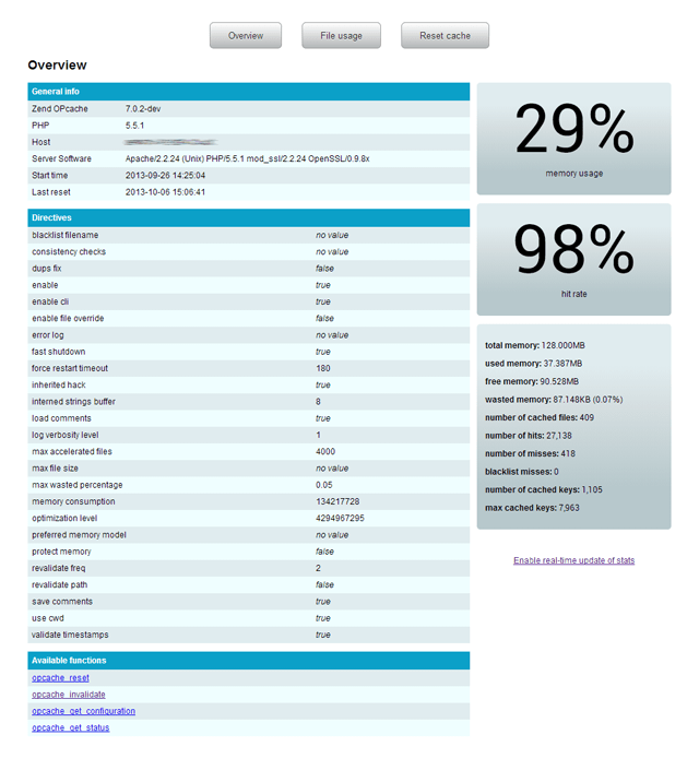 The overview will show you all the core information. From here you'll be able to see what host and platform you're running on, what version of OPcache you're using, when it was last reset, the functions that are available, all the directives and all the statistics associated with the OPcache (number of hits, memory used, free and wasted memory, etc.)