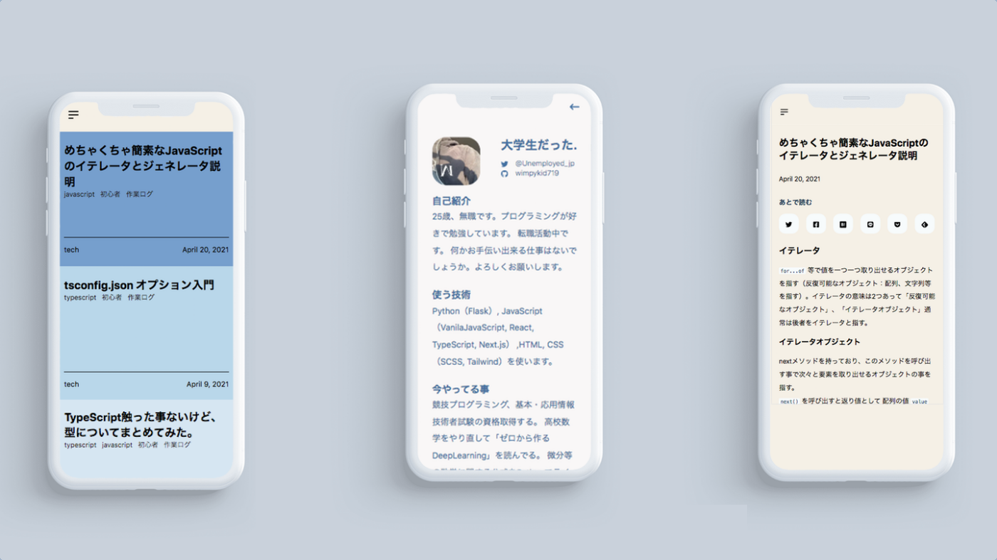 より具体的な機能の解説はブログで書いています。 【無料運用】Zennの投稿記事を使ったブログをNext.js, Tailwindcss, TypeScript, Vercelで構築した。