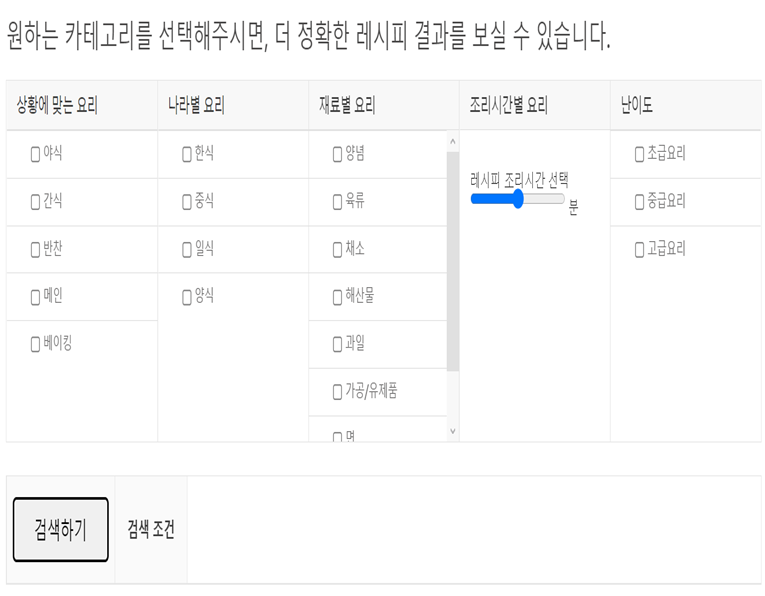 - ๋ค์ฏ๊ฐ์ง ์นดํ ๊ณ ๋ฆฌ์์ ์ฒดํฌ๋ฐ์ค๋ฅผ ํตํด ์ค๋ณต์ฒดํฌํ์ฌ ๋ ์ํผ๋ฅผ ๊ฒ์ ๊ฐ๋ฅํฉ๋๋ค.