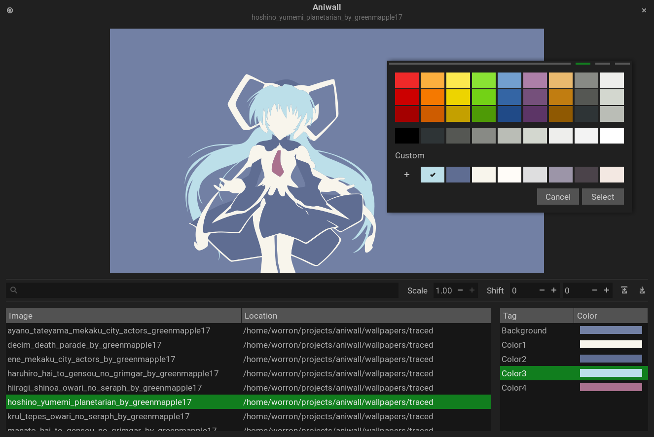 $ python3 ~/aniwall/setup.py installImage patterns distributed separately from application. Using --recursive with git clone command you can automatically download base images pack to the same folder, otherwise get the images from wallpapers submodule in any other way. Anyway, you should set images location in application preferences on first launch.