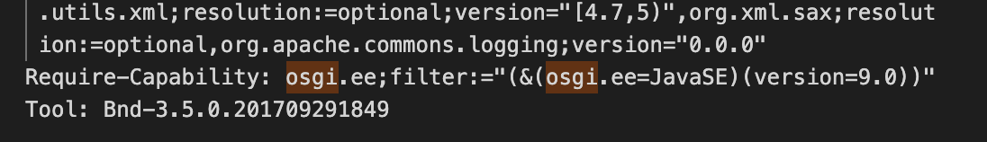 The reasoning for the issue is the maven bundle plugin impose restriction to allow Java 9 or more runtimes as shown below as per the MANIFEST.MF of that bundle.