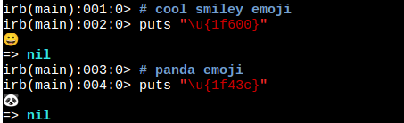 BTW; it can also do emojis... Just have to output the unicode for it: Like so: https://github.com/JessTaDa/display-emoji-in-terminal-ruby |