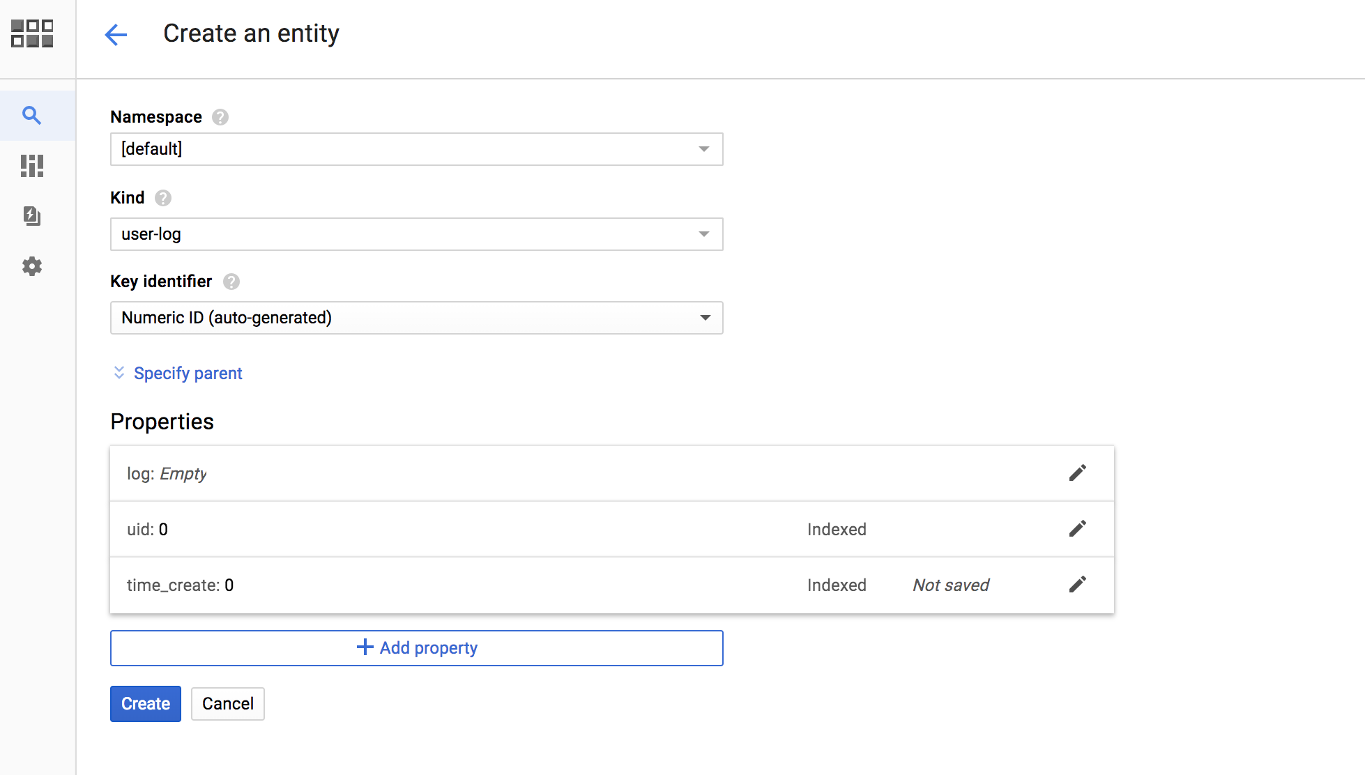 Name: log Type: Text Value: "My very first log on datastore!"Click Done.