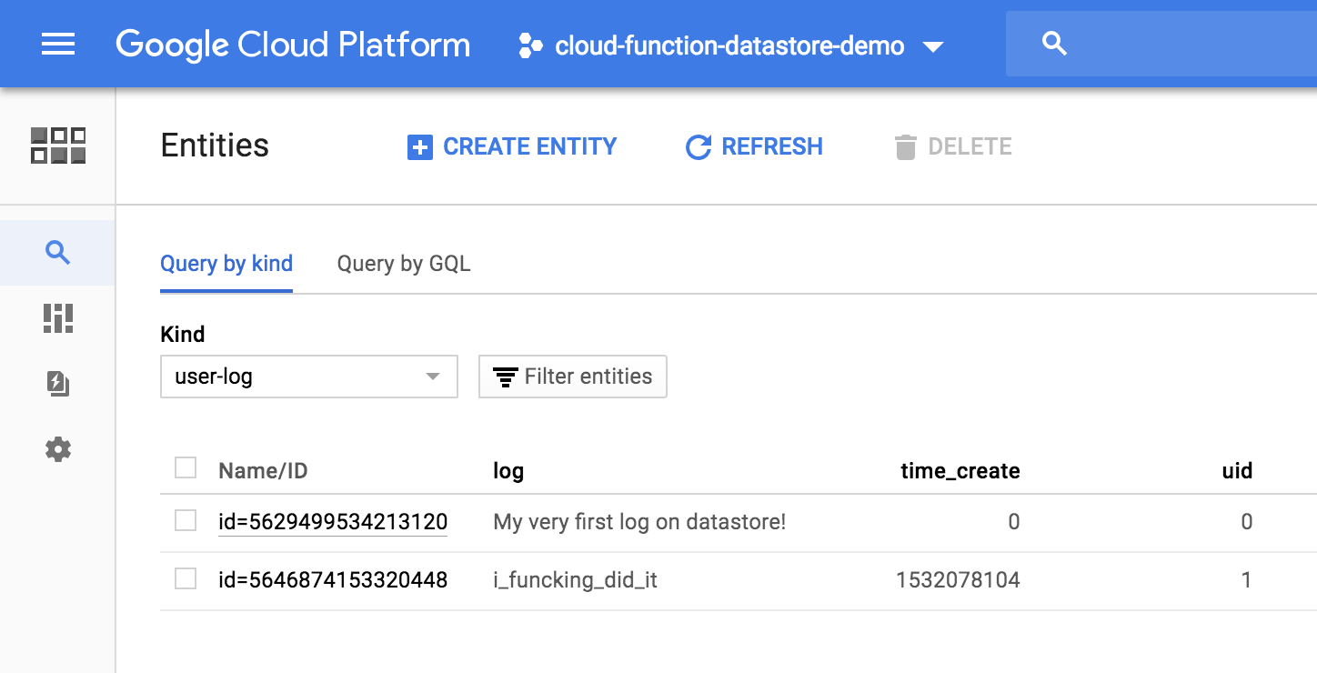We just saved a log to Datastore without deploying a server. Its exciting to think about what we can do next with Cloud Function and its server-less implementation. Anything!
