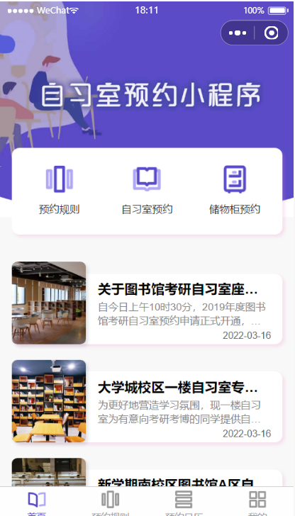 自习室预约小程序,在线预约的便捷性,用户可以查看到整个房间的桌面布局情况,可以根据位置喜好预约座位,如发生突发事件,可以提前免费取消预约。持续优化用户体验,让每人都有可以学习的舒适空间,获得一个良好的学习环境。功能包括预约规则,自习室预约,储物柜预约等模块。