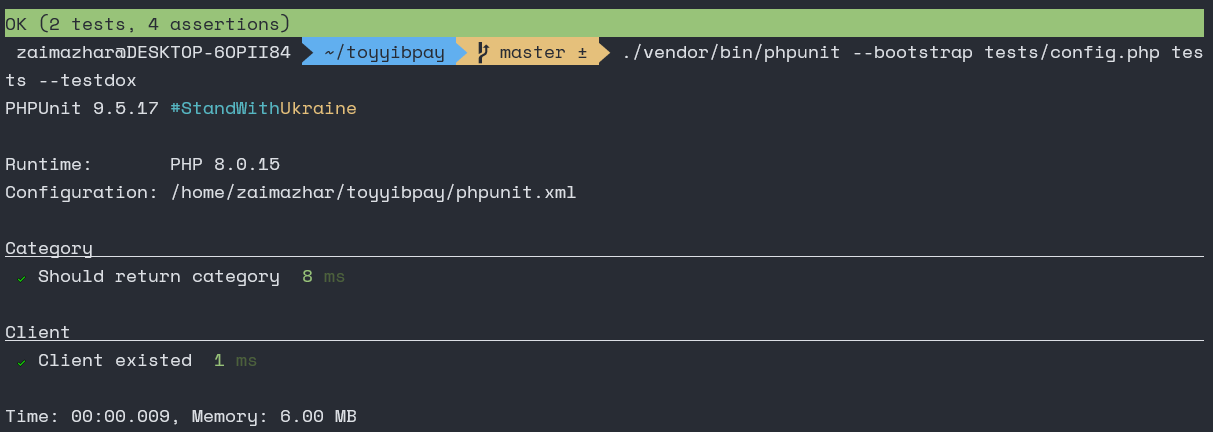 ./vendor/bin/phpunit --bootstrap tests/config.php tests --testdoxExpected Result
