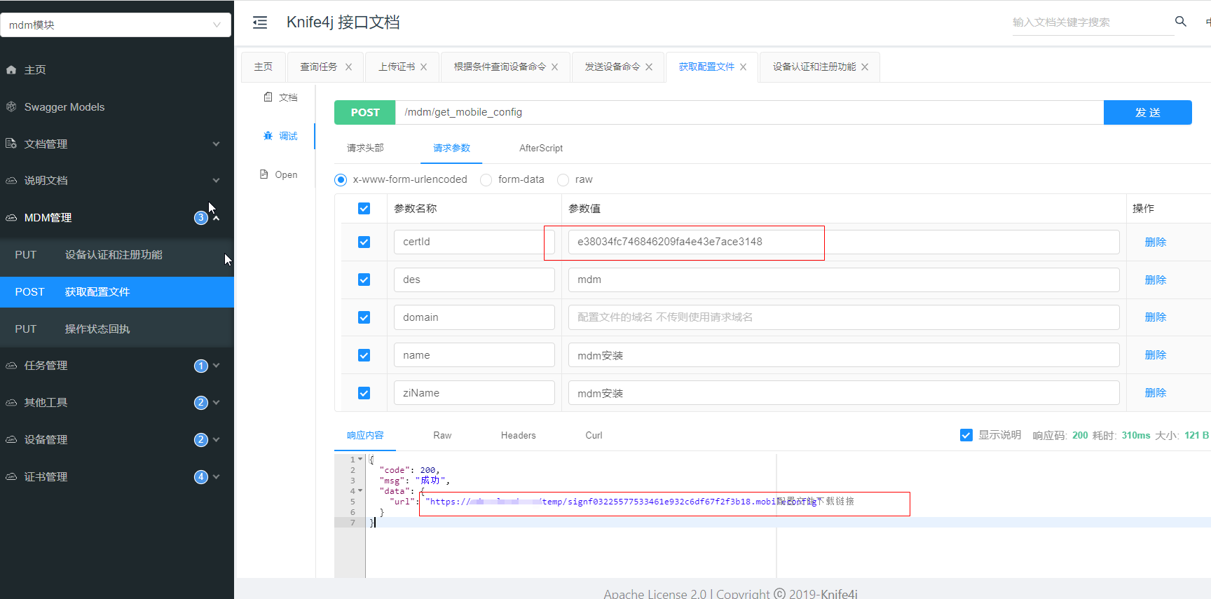 yum install docker -y && systemctl start docker && systemctl enable docker && docker run -tdi --privileged -p 10800:10800 -p 10801:10801 --name mdm -d --restart always docker.io/2524931333/centos7mdm:v1 init命令完成后其实已经启动成功你可以通过 http://你的服务器公网ip/doc.html 访问接口文档