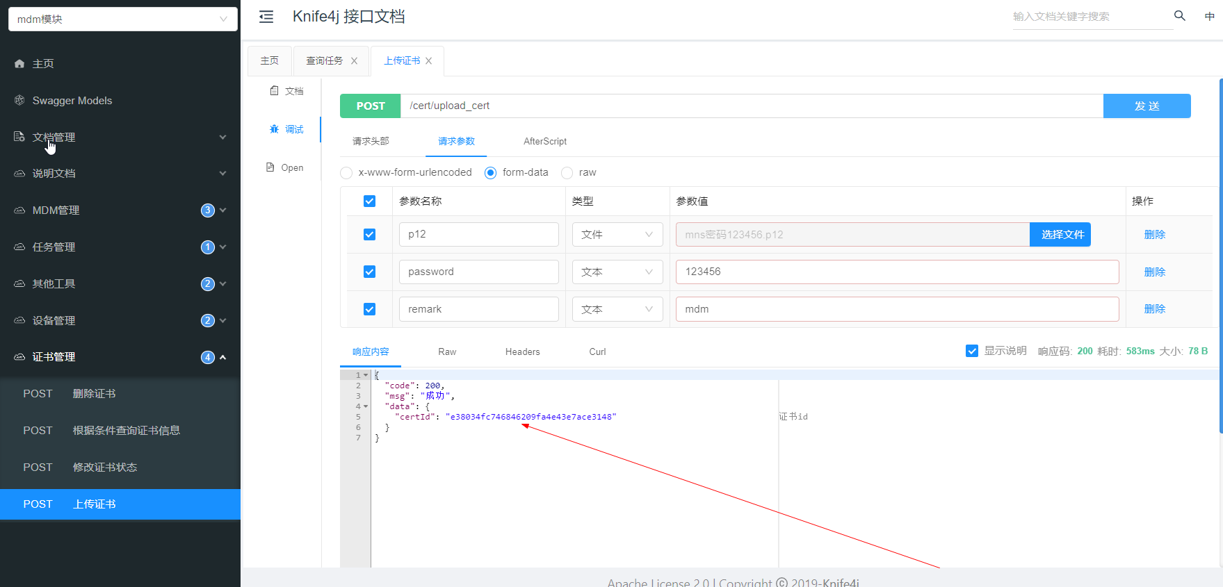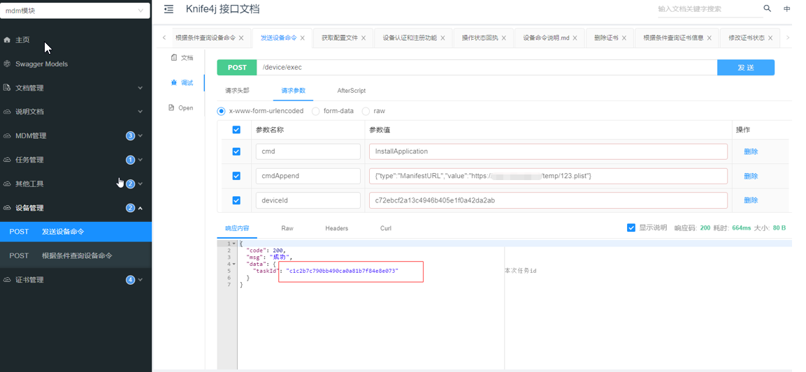- 向设备发送命令 命令有很多我们暂时只演示安装app 这里的plist文件可以在其他工具接口制作 会返回一个任务id 任务id可以查看这个任务是否执行成功和获取手机信息的一些返回 在此不在演示