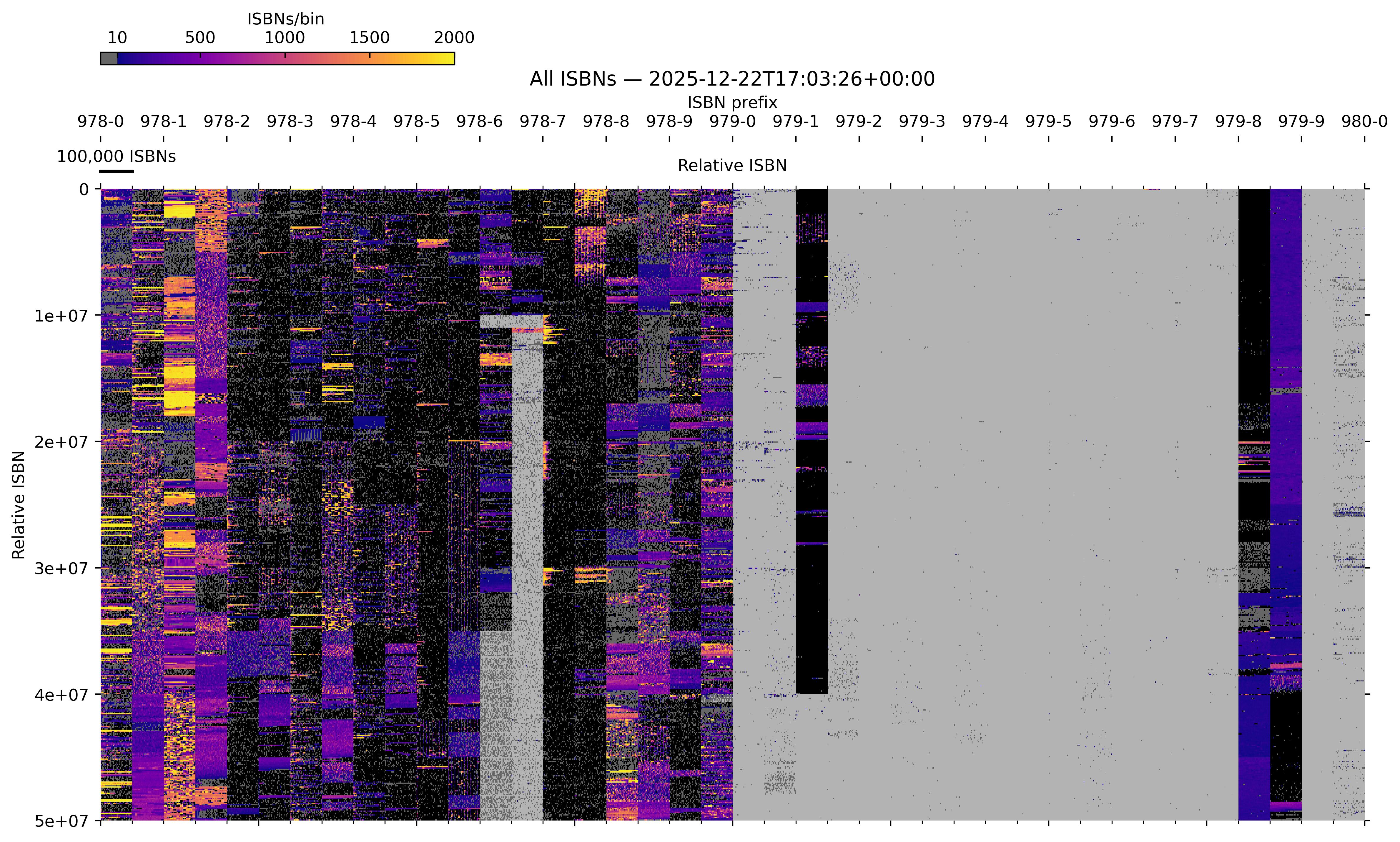 Binned image (hi-res version) of all known ISBNs (data source: Anna's Archive). The defined ISBN registration groups are underlaid in black. See here how it is plotted.