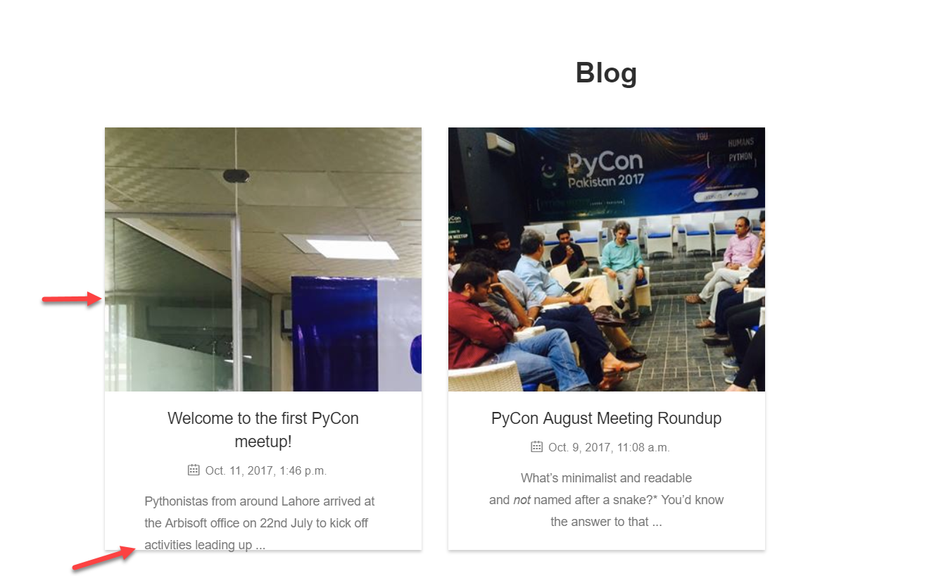 Site url: http://pycon.pk/ 1. Scroll to blog section 2. The featured blog images should appear complete. 3. The partial text provided should have a limit of 2 lines as the text on the first one is falling out of the block boundary PFA